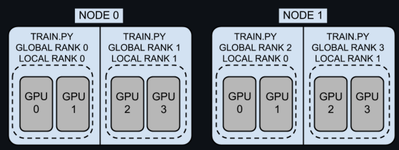 - 각 process당 2개의 GPU를 가지며, 각 process는 rank로 식별됨